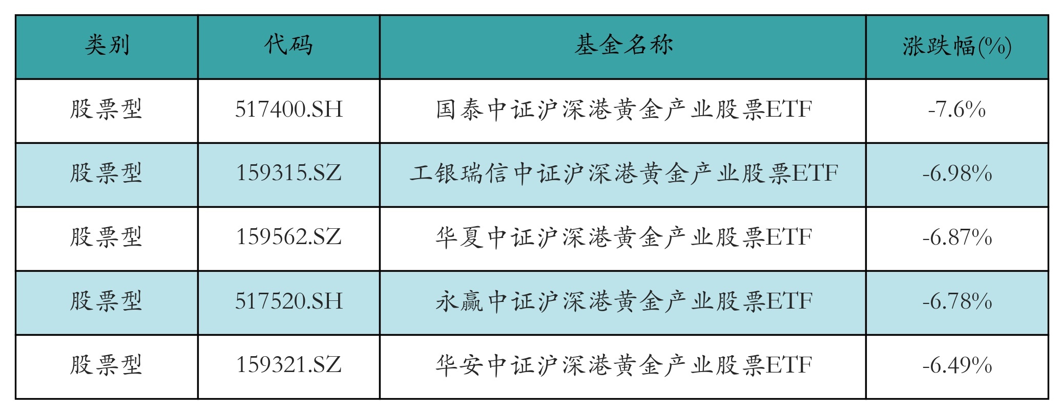 上周股票型ETF跌幅最大的5只ETF及其收益率分别为:国泰中证沪深港黄金产业股票ETF(-7.6%)、工银瑞信中证沪深港黄金产业股票ETF(-6.98%)、华夏中证沪深港黄金产业股票ETF(-6.87%)、永赢中证沪深港黄金产业股票ETF(-6.78%)、华安中证沪深港黄金产业股票ETF(-6.49%)。详情见下表: