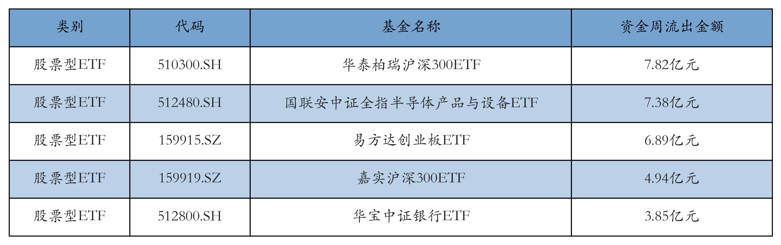 上周股票型ETF资金流出最多的5只ETF及其流出金额分别为:华泰柏瑞沪深300ETF(流出7.82亿元)、国联安中证全指半导体产品与设备ETF(流出7.38亿元)、易方达创业板ETF(流出6.89亿元)、嘉实沪深300ETF(流出4.94亿元)、华宝中证银行ETF(流出3.85亿元)。详情见下表: