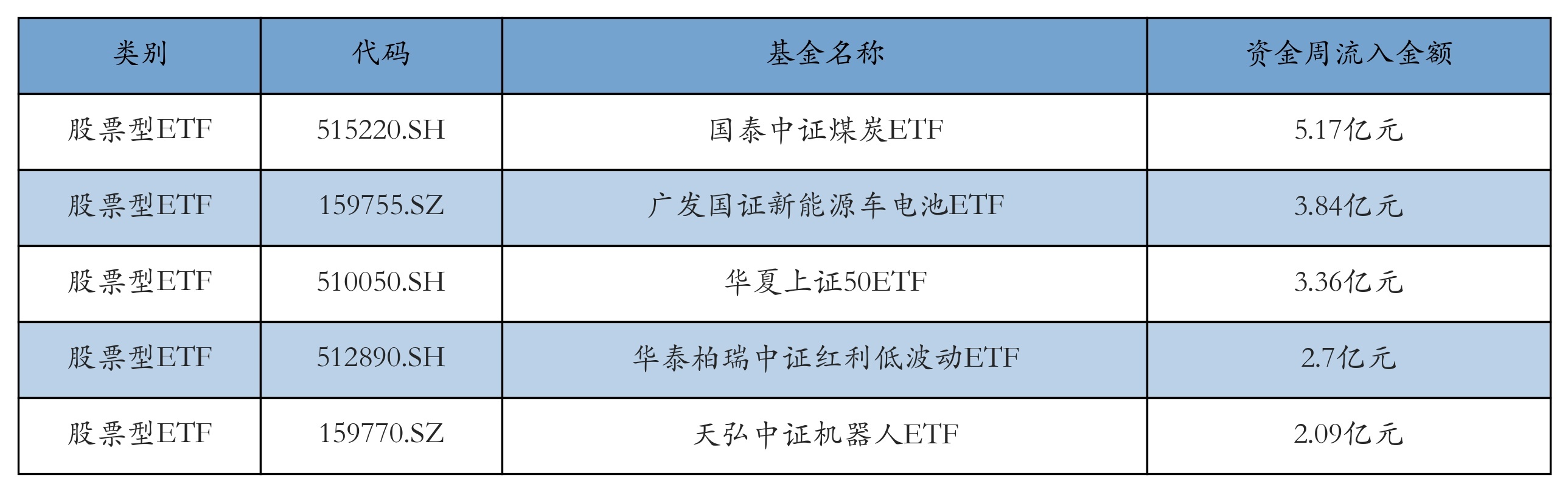 上周股票型ETF资金流入最多的5只ETF及其流入金额分别为:国泰中证煤炭ETF(流入5.17亿元)、广发国证新能源车电池ETF(流入3.84亿元)、华夏上证50ETF(流入3.36亿元)、华泰柏瑞中证红利低波动ETF(流入2.7亿元)、天弘中证机器人ETF(流入2.09亿元)。详情见下表: